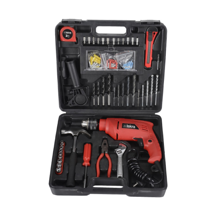 Pribor – Dodatna ručka, merač dubine bušenja, tesarski čekić 227 g, kombinovana i podesiva klešta, magnetni produžetak nastavaka, tapetarski nož, metar (2 m), set nasadnih ključeva, set 25 mm nastavaka, set bitova, šarafi sa zidnim umecima